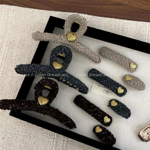 Precio original USD$0.50 - Precio original USD$0.53Precio original USD$0.50USD$0.89 - USD$1.06USD$0.89 - USD$1.06Precio actual USD$0.89Wholesale Golden love knitted fabric hairpin vintage claw shark clip headdress hair accessories